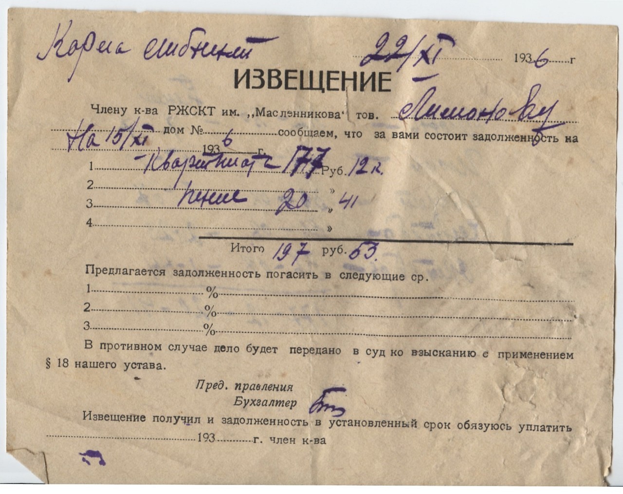 Экспонат - Извещение члену к-ва РЖСКТ им.Масленникова входит в коллекции